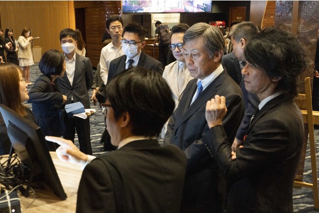 ホワイエでのタッチパネルによる実演(写真中央:在香港日本国総領事館岡田健一総領事(大使))