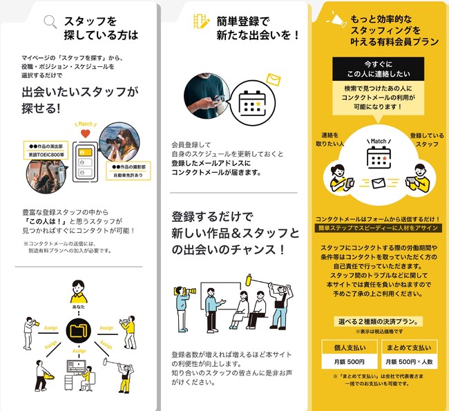 本サービスの特徴は、【誰でも無料で会員登録ができる】こと(※有料プランあり)【映像制作の幅広い職種の方が登録できる】ことが挙げられます。会員は登録されている全てのスタッフの中から希望する条件(役職、ポジション、スケジュール等)に合致したスタッフの検索およびプロフィール閲覧が可能で、必要に応じていつでもコンタクトを取ることができ、サイトに訪れるだけで必要な職種のスタッフを見つけることができます。