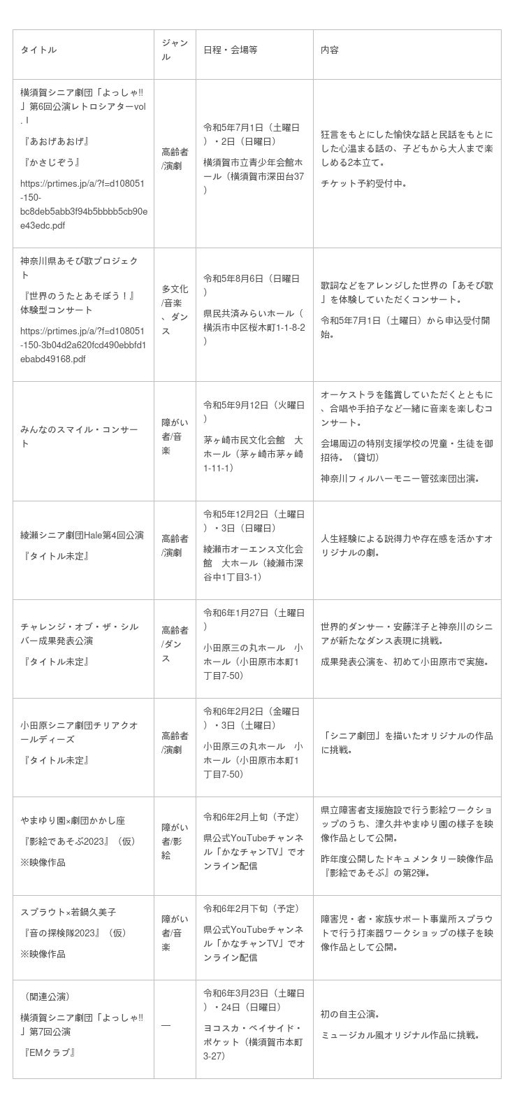 神奈川県では、文化芸術の魅力で人を引きつけ、地域のにぎわいをつくり出す、マグネット・カルチャー(マグカル)の取組を通じて、共生社会の実現を後押ししています。 このたび、年齢や障がいなどにかかわらず、子どもから大人まで、すべての人が舞台芸術に参加し楽しめる「共生共創事業」の令和5年度のラインアップを決定しましたので、お知らせします。