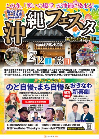 この冬、笑いの殿堂「なんばグランド花月」において、沖縄県市町村自治体と吉本興業がタッグを組んだ『沖縄フェスタinなんばグランド花月』を2月12(土),13日(日)の2日間で開催いたします。