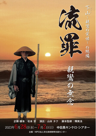NPO法人文化芸術教育支援センター主催、『流罪〜親鸞の無念〜』が2023年6月28日 (水) 〜2023年7月2日 (日)に中目黒キンケロ・シアター(東京都目黒区青葉台1-15-11)にて上演されます。 チケットはカンフェティ(運営:ロングランプランニング株式会社、東京都新宿区、代表取締役:榑松 大剛)にて発売中です。