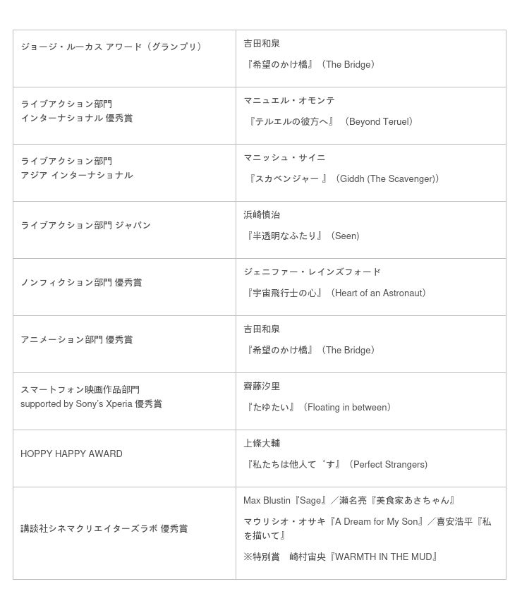 ライブアクション部門インターナショナルはスペインのマニュエル・オモンテ監督「テルエルの彼方へ」 、ライブアクション部門アジア インターナショナルはのインドのマニッシュ・サイニ監督「スカベンジャー」 、ライブアクション部門ジャパンは浜崎慎治監督の「半透明なふたり」、ノンフィクション部門はスペインのジェニファー・レインズフォード監督「宇宙飛行士の心」、アニメーション部門はポーランド在住日本人の吉田和泉監督「希望のかけ橋」が受賞しました。