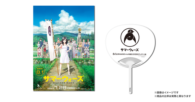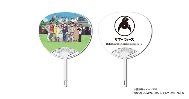 8月1日の栄おばあちゃんの誕生日にご来場いただいた方に、『サマーウォーズ』の陣内家の家紋入りのオリジナルうちわを数量限定で配布いたします。