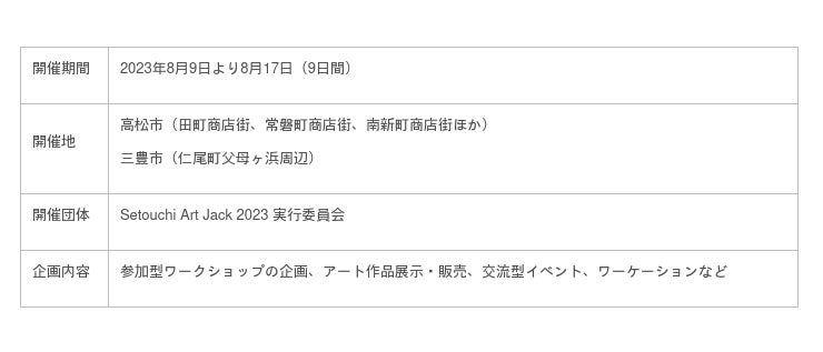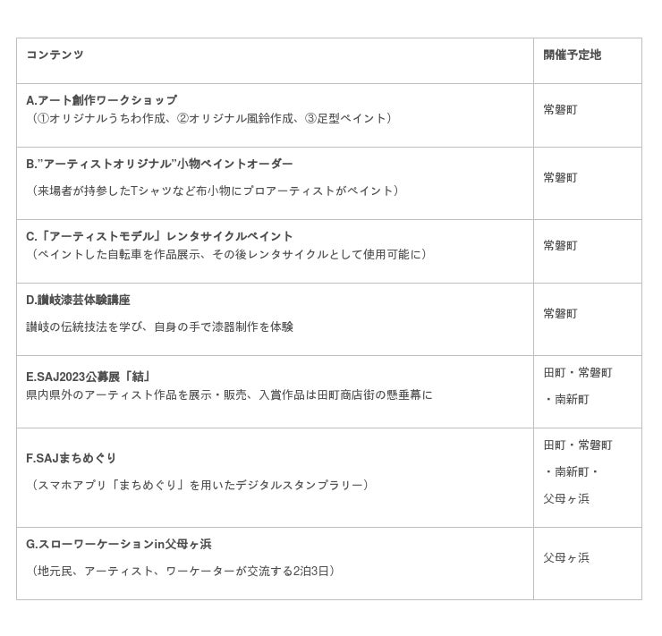 アートを活用した地方創生、関係人口創出に取り組む株式会社MIX UP(本社:香川県高松市、代表取締役 香川智彦)は官民の様々な団体の協賛・後援・協力のもと2023年8月9日(水)より17日(木)までの9日間、第2回となる「Setouchi Art Jack 2023(以下、SAJ2023)」を開催します(令和5年度観光庁「インバウンドの地方誘客や消費拡大に向けた観光コンテンツ造成支援事業」採択)。 開催地は2022年10月に第1回SAJ2022を実施した高松市の南部3町商店街(南新町商店街・常磐町商店街・田町商店街)に三豊市仁尾町父母ヶ浜が加わります。 アートにちなんだ参加型ワークショップの企画、協力店舗・スポットでのアート作品展示(Art Jack)、アーティスト公募展(賞金付コンペ)、交流・関係構築イベント、ワーケーション(父母ヶ浜)などを企画します。アート作品の出品、ワーケーション参加は本日(6/30)より募集を開始します。