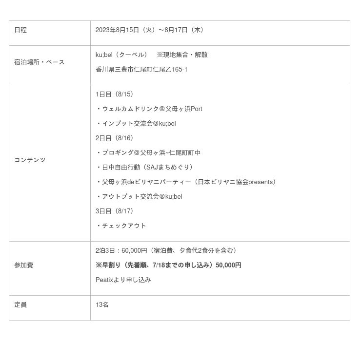 1泊参加や日帰り(交流会)参加など募集詳細や申し込みについてはPeatixより確認ください。