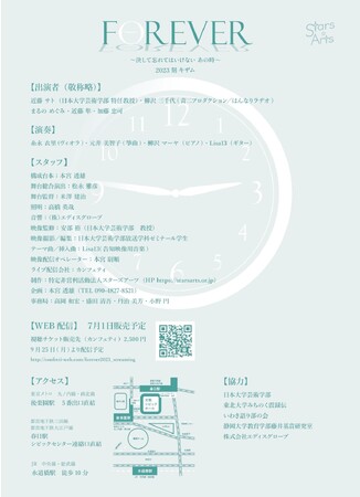 特定非営利活動法人スターズアーツ(理事長:本宮透雄)主催、『Forever〜決して忘れてはいけない あの時〜2023 刻 キザム』が2023年8月31日 (木)に文京シビックホール 小ホール(東京都文京区春日1丁目16-21)にて上演されます。 チケットはカンフェティ(運営:ロングランプランニング株式会社、東京都新宿区、代表取締役:榑松 大剛)にて発売中です。