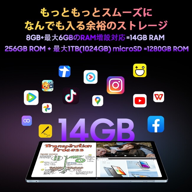 大容量メモリ(14GB(8GB+6GB拡張)RAM+256GB ROM+1TB TF拡張)
