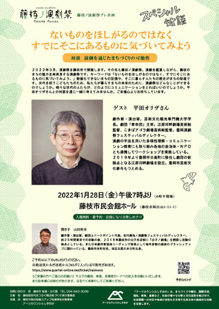 「藤枝ノ演劇祭」は、演劇を鑑賞しながら藤枝のまちの魅力を再発見する演劇祭です。キーワードは「ないものをほしがるのではなく、すでにそこにあるものに気づいてみよう。」数値化できないまちの記憶や、そこに暮らす人たちの歴史がまちの財産です。次代を担うこどもたちのため、私たちが暮らすまちの未来のために、演劇祭はどんなことができるのでしょうか。様々な世代の人たちが、どのようにコミュニケーションをとればいいのでしょうか。平田オリザ氏との対談を通じ、ご来場の皆様と一緒に考えます。