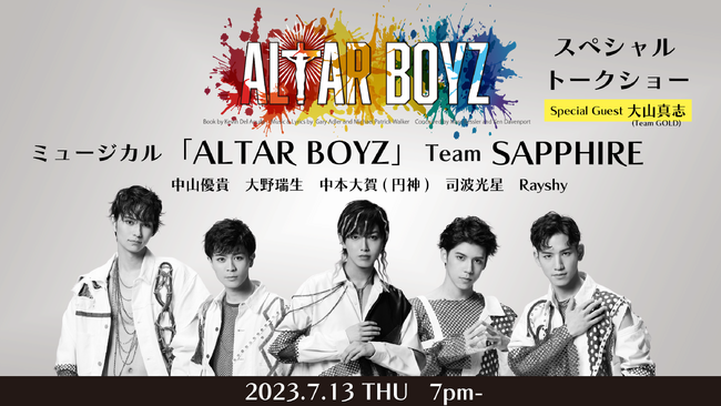 「ALTAR BOYZ」開幕を記念したPRイベント、『ミュージカル「ALTAR BOYZ」Team SAPPHIREスペシャルトークショー』を7月13日(木)に開催決定!ゲストにTeam GOLDの大山真志を迎え、ここでしか聞けないあんな話、こんな話が飛び出すかも!?熱く楽しいひとときをご一緒にお楽しみ下さい。