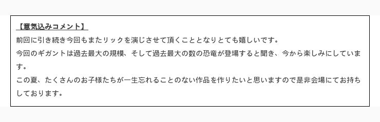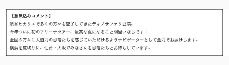 想像をはるかに超えた恐竜たちの史上最大級のギガントパフォーマンス、そしてナビゲーターたちの活躍をぜひ会場で体験してください。
