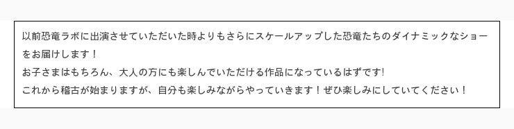 本公演は、広大なフィールドの中であたかも生きているかのような恐竜が観客の目の前を自由に歩き回り、まさに恐竜の世界に自分自身が入り込んだかのような体験を味わうことができます。