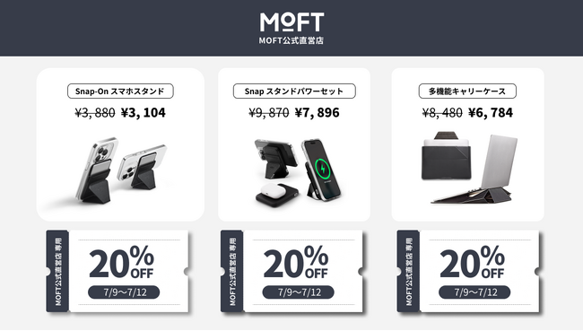 シンプルかつクリエイティブなPC・スマホ・タブレット周辺のアイデア商品を開発し続けるMOFT(モフト)ブランド(LEMORE社、本社:アメリカカリフォルニア、代表取締役:Julianna He)が、来るAmazonプライムデーにて一般開催期間に先行して2023年7月9日(日)よりキャンペーンを開催。MOFTアマゾン直営店にて、超人気商品「Snap スタンドパワーセット」がAmazon初の20%OFF割引をはじめ、各種定番商品も特大割引価格でご用意しております。