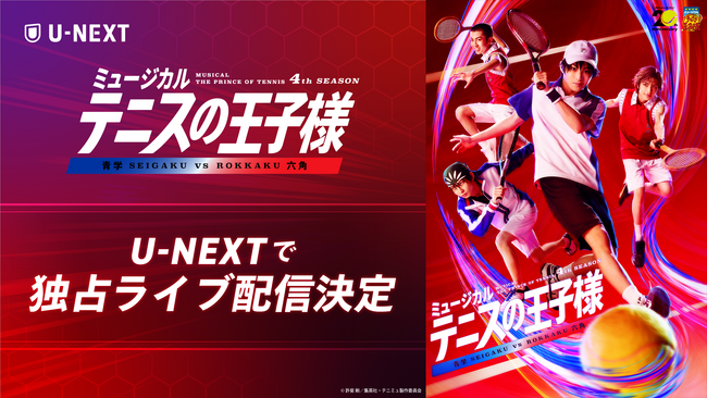 USEN-NEXT GROUPの株式会社U-NEXT(本社:東京都品川区、代表取締役社長:堤 天心)が運営する動画配信サービス「U-NEXT」は、2023年7月15日(土)より上演される「ミュージカル『テニスの王子様』4thシーズン 青学(せいがく)vs六角」を独占でライブ配信いたします。ライブ配信の対象となるのは、7月15日(土)17:30公演<東京公演 初日>、8月27日(日)12:30/17:30公演<東京凱旋公演>、9月3日(日)12:30公演<東京凱旋公演 大千秋楽>の計4公演です。