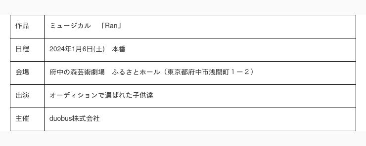 子供達が主役の日本発ミュージカル「Ran」オーディション開催!夏休みミュージカルワークショップは初心者も歓迎