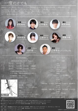 ミューズエンタープライズ主催、『一度だけでも』が2023年8月4日 (金) 〜2023年8月6日 (日)に代々木ミューズホール(東京都渋谷区代々木1丁目31-2)にて上演されます。 チケットはカンフェティ(運営:ロングランプランニング株式会社、東京都新宿区、代表取締役:榑松 大剛)にて発売中です。
