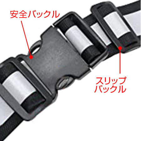 ABS樹脂製造の安全バックルで簡単装着、スリップバックルで簡単サイズ調整可能です。