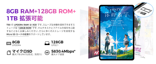 Teclast「T50」は、UNISOC Tiger T616は12nmプロセスを使用し、2つのArm Cortex-A75ハイパワーコアと6つのCortex-A55インテリジェントAIコアを搭載しています。発熱を抑えながら優れた性能を維持します。RAMは8GBで、スムーズな体験を提供できます。ストレージは128GBで、マルチタスクとファイルの保存を心配することなく楽しめます。更に多くのストレージを実現するMicro SDカードの拡張もサポートしています。