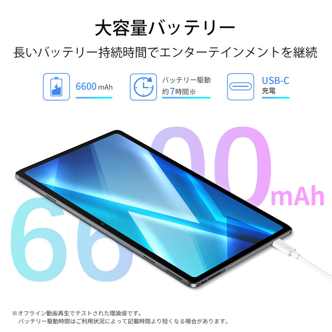 【8GBのランニングメモリと128GBの高速ストレージを搭載】ストレージに拡張可能なMicroSDをサポートしています。メモリ容量が大きいとタブレットはサクサク動くようになります。Webサイトや動画を見たり、重いアプリや高画質のゲームを楽しみいただきます。お気に入りの本、曲、写真、映画、ゲームなど、好きなものをすべてダウンロードして保存できます。容量不足に困ることなく十分にお楽しみいただきます。6600mAhの大容量バッテリーとAIインテリジェント電源管理により、7時間の映画・読書・ブラウジングを楽しむことができます。