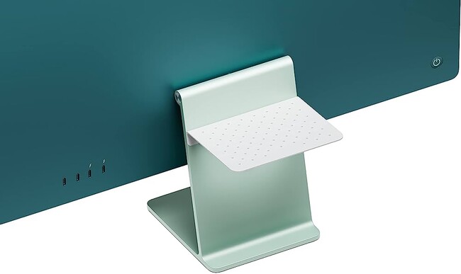 BackPackは、外付けディスク、ケーブル、ドングルなどの専用のスペースを確保し、作業環境をすっきりさせることができるiMacを拡張する収納棚です。付属の調整用ストラップにより、外付けディスクや周辺機器が落ちないように固定できます。しかもBackPackの上部または底面部のどちらにも設置できます。