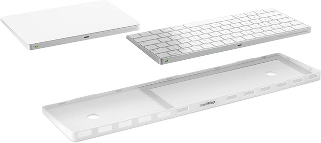 MagicBridgeを使用することで、Magic KeyboardとMagic Trackpadが一つのデバイスに。離れたソファからのMacの操作も、膝上で簡単に行うことができます。デスクまわりもスッキリし、より快適な環境を実現します。MagicKeyboardとTrackpadの配置は左右自由に設置可能です。