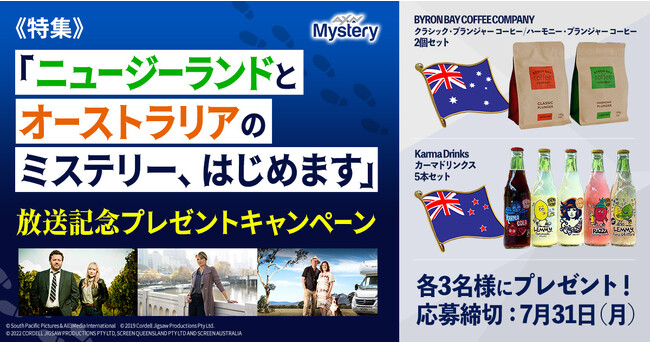 日本唯一のミステリードラマ専門チャンネル AXNミステリー(AXN株式会社、本社:東京都渋谷区、代表取締役社長 大園天樹)は、 近年、映像産業で世界的に存在感を増してきているニュージーランドとオーストラリアのミステリードラマを、『ニュージーランドとオーストラリアのミステリー、はじめます』と題して特集放送します。 「シェパード警部 ブロークンウッドの事件簿(シーズン1〜3)」「アレクサの殺人ファイル〜メルボルン編」「ダービーとジョーン キャンピングカーの旅事件簿」の3作品を、AXNミステリー独占*で7月16日(日)より日本初放送いたします。