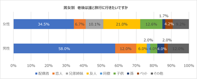 “老後は誰と旅行に行きたいか”の質問に、「配偶者・恋人」と答えたのが全体の49.5%を占めたものの、男女別にみると、男性70.0%(配偶者58.0%・恋人12.0%)に対し、女性は41.2%(配偶者34.5%・恋人6.7%)と大きな差がでました。