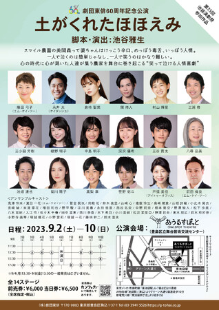 劇団東俳60周年記念公演『土がくれたほほえみ』が2023年9月2日 (土) 〜2023年9月10日 (日)にあうるすぽっと(東京都豊島区東池袋4-5-2ライズアリ-ナビル2F・3F)にて上演されます。 チケットはカンフェティ(運営:ロングランプランニング株式会社、東京都新宿区、代表取締役:榑松 大剛)にて発売中です。