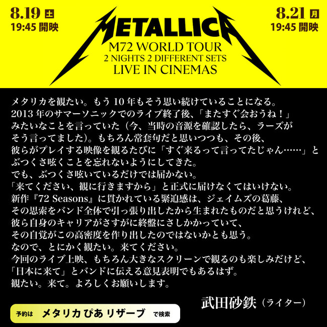 ⚡️8/19 & 8/21⚡️映画館でライブをディレイ中継 メタリカ『M72 WORLD TOUR LIVE FROM ARLINGTON, TX』テキサスから日本へ!