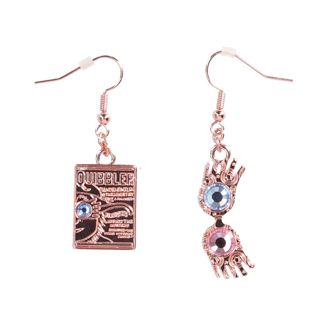 ルーナ・ラブグッドの象徴的なアイテム、「ザ・クィブラー」と「メラメラメガネ」をモチーフにしたピアスとイヤリングです。肌になじみやすいピンクゴールドのカラーで、「ザ・クィブラー」の表紙やメラメラメガネの柄を凹凸で表現しました。