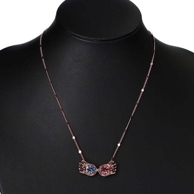 胸元で「メラメラメガネ」がきらりと光る、ピングゴールドのネックレスです。留め具部分には「ザ・クィブラー」モチーフのパーツが付き、後ろ姿のアクセントになります。チェーン部分には、様々な色の小さな宝石のようなパーツがあしらわれています。