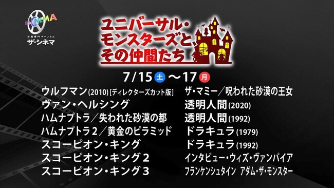 洋画専門チャンネルザ・シネマ(AXN株式会社、本社:東京都渋谷区、代表取締役社長 大園天樹)では、歴史あるユニバーサル映画が生み出した怪奇キャラクター「ユニバーサル・モンスターズ」作品を、関連作と一緒に特集放送いたします。 7月15日(土)〜17日(祝・月)に暑い夏にぴったりのホラー・スリラー・SF14作品をお届けいたします。