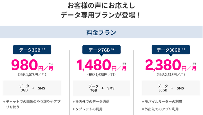 2023年7月14日(金)午前9時より、データ通信専用となる新プラン「データ専用プラン」を提供開始しました。本プランは、従来の音声通話付きプラン同様、月間データ容量に応じた3つのプランから選択可能な料金プランです。