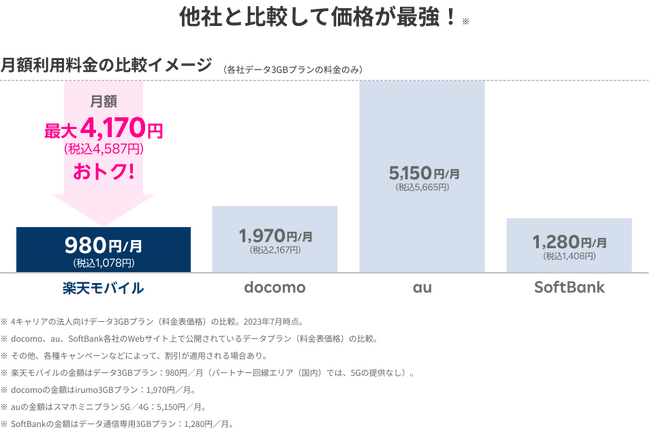 楽天モバイル株式会社(以下「楽天モバイル」)は、本日2023年7月14日(金)午前9時より、「データ専用プラン」(以下「本プラン」)を新たに提供開始しました。 本プランは、2023年7月14日(金)午前9時より「楽天モバイル法人プラン」公式サイト、「楽天モバイル法人コミュニケーションセンター」および「楽天モバイルショップ」からお申し込みいただけます(注1、2)。
