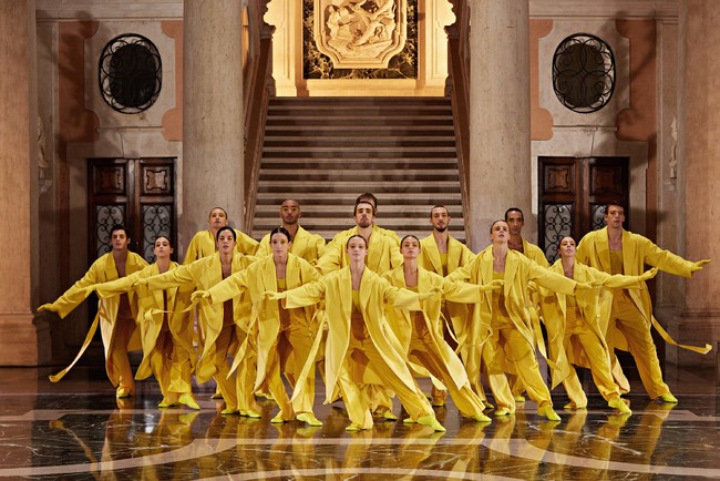 「ディエゴと私は、振り付けが完成する前から、プロジェクトに取り掛かりました。その結果、衣装の物理的な特性に合わせて、動きを考えるという非常に刺激的な取り組みになりました。衣装、特にコートによって動きが制限されることで、ダンスが生まれるのです。一般的にはその逆の流れだと思います。私のインスピレーションは、街中で見かけるような服を原色のブロックでまとめ、歴史ある場所とのコントラストを効かせることでした。つまり、平凡を非凡にするという試みだったのです」と、イアン・グリフィスは語ります。