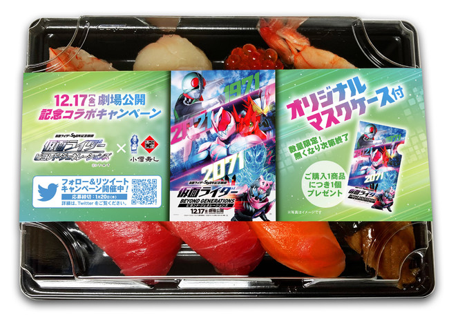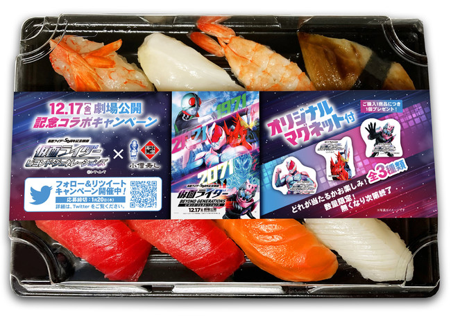 株式会社小僧寿し(東京都中央区、代表取締役・小林剛)は、2022年1月10日(月)〜2022年1月20日(木)までの期間限定で、 2021年12月17日(金)公開の仮面ライダー50周年記念映画『仮面ライダー ビヨンド・ジェネレーションズ』(製作:「ビヨンド・ジェネレーションズ」製作委員会 [c] 石森プロ・テレビ朝日・ADK EM・東映 /配給:東映)とのコラボ企画を開催いたします。