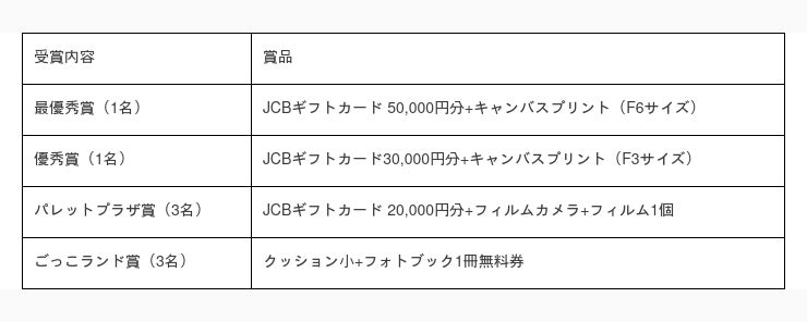 ご応募いただいた作品の中から、「最優秀賞 」「優秀賞」「パレットプラザ賞」「ごっこランド賞」の4つの部門で、笑顔のフォトコンテストの入賞者を選定します。入賞者には、JCBギフトカード50,000円分や、応募作品で作るパレットプラザのオリジナルフォトグッズ「キャンバスプリント」「クッション」「フォトブック」など、豪華賞品をご用意。さらに参加賞として、ご応募いただいた方の中から抽選で100名様に、全国のパレットプラザで使えるお得なクーポン券をプレゼント!