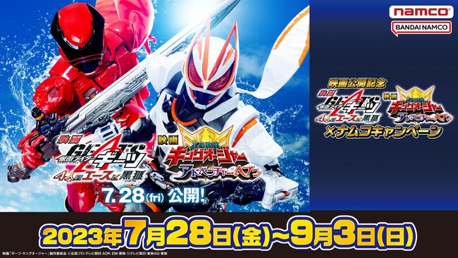 株式会社バンダイナムコアミューズメントは、映画『仮面ライダーギーツ 4人のエースと黒狐』、映画『王様戦隊キングオージャー アドベンチャー・ヘブン』の公開を記念して、映画グッズがもらえるキャンペーンを、全国約70店舗のアミューズメント施設「namco」で2023年7月28日(金)〜9月3日(日)まで開催します。