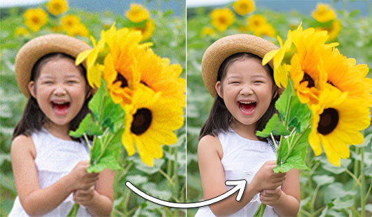 古い写真や、小さいサイズの写真を高画質化する際に、顔のディテールを鮮明に復元します。また、かすみ除去、ノイズ除去、手ぶれ補正、高解像度化のすべての処理を一度に行います。