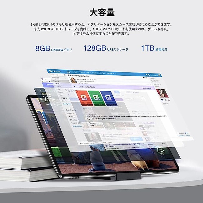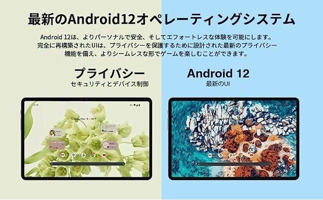【最新のAndroid 12搭載の超高性能8コアタブレット】こちらのタブレットは、最新のAndroid 12を搭載しています。最新のアプリやゲームを快適に楽しむことができます。また、高度なセキュリティ技術を使用し、プライバシーを守りながら安心してご利用いただけます。パープルライト展示錐高性能T616、8コア2.0Ghz CPUを搭載し、高速かつ省エネな処理が可能です。さらに、「Mali-G57」の高性能GPUも搭載され、グラフィック処理も強化されています。ゲームやビデオのスムーズな再生を楽しめます。さらに、8GBのRAMと128GBの高速ストレージが搭載されています。最大1TBまでのメモリ拡張も可能で、ビデオ、電子書籍、ゲーム、音楽などを心配することなくダウンロードできます。