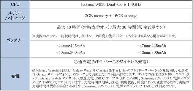 さらに、Galaxy Watch6シリーズは、より大きく明るいディスプレイに対応するために大容量バッテリーを搭載し、消費電力を削減※23しました。わずか約8分の急速充電で約8時間の追加使用が可能となり、夜間の睡眠管理※24にも最適です。