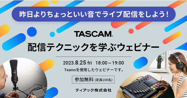 ティアック株式会社 (本社:東京都多摩市、代表取締役社長:英 裕治) は、ライブ配信音声テクニックをご紹介するウェビナーを開催いたします。