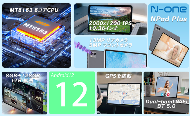 Android 12 10.4インチ タブレット wi-fiモデル、 N-one NPad Plus タブレット、MTK 8183 8コアCPU 2.0GHz、2000*1200 2K解像度 FHD IPSディスプレイ、8GB RAM+128GB ROM+1TB TF拡張可能+、13MP/5MPカメラ、GMS認証+Type C充電+2.4G/5G Wi-Fi対応、Bluetooth5.0+GPS