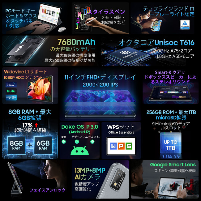 Blackview Tab16 タブレット11インチには最新のAndroid12が搭載されており、よりパーソナライズで安全かつ操作しやすいシステムエクスペリエンスを提供する。ユーザーはUIの配色やウィジェットなどを自由自在にカスタマイズすることができる。また、クリックやスワイプ、スクロールもよりスムーズに行えるようになった。スクリーンショットやフローティングウィンドウアニメーションを、人間が滑らか感じられるようDokeOS_P 3.0 でブラッシュアップしています。Doke OS_P 3.0は、見落とされがちな操作にも着目。アプリのグループ化やフォルダの解除、レイアウトロック、アイコンのカスタマイズなど簡単に行うことができます。バッテリー残量や音量警告、USB接続時や通話中のガイドなど、かゆいところに手が届くOSです。
