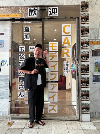 玉袋も駐車場を見学に行き、愛車との写真撮影に応じるなどのファンサービスをする場面も。周囲には多くの人だかりができていた。