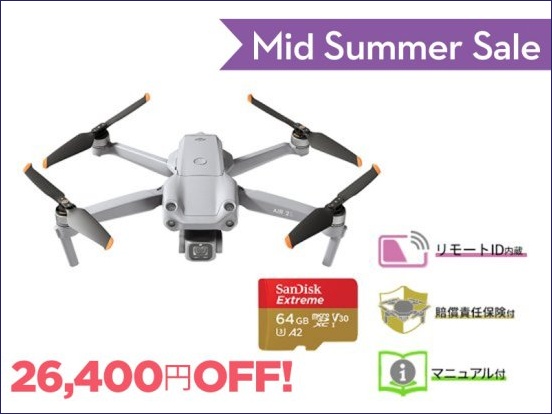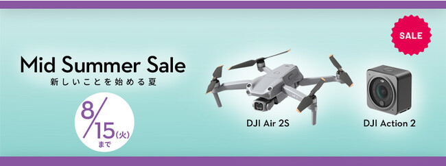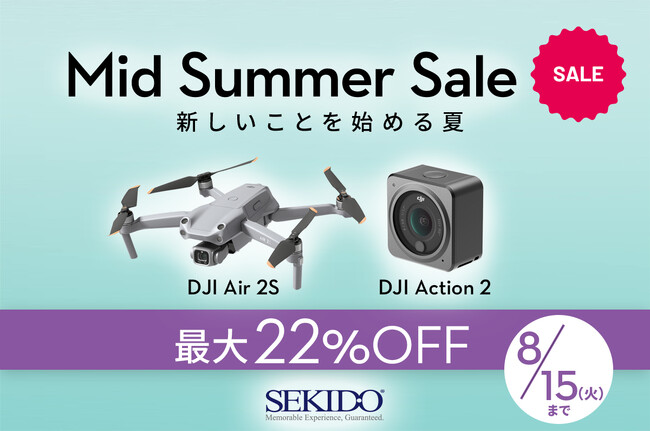 日本初のDJI正規販売代理店である株式会社セキド(本社:東京都港区、代表取締役:大下貴之)では、初心者でも安定した高画質な空撮ができるドローンと、アクティブな撮影を実現するウェアラブルアクションカムを対象に、最大 22%OFFとなる「DJI Mid Summer Sale(ディージェーアイ ミッドサマーセール)」を8月1日(火)より開催いたします。1インチセンサーカメラ搭載で機能と操作性、価格のバランスが良い人気ドローン DJI Air 2S(エアー ツーエス)と、マグネット式マウントでどこにでも取り付けてアクティブに撮影できるアクションカム DJI Action 2(アクション ツー)を対象に、DJI製品でこの夏を盛り上げるビッグセール。レジャーやイベント、夏休みの思い出を高画質撮影で残す絶好のチャンスです。