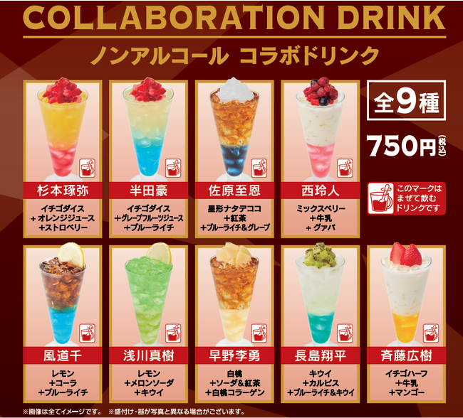 BLACK IRIS(ブラックアイリス)のメンバー各々が組み合わせをチョイスし考案したコラボドリンク全9種【各750円(税込)】をご用意します。