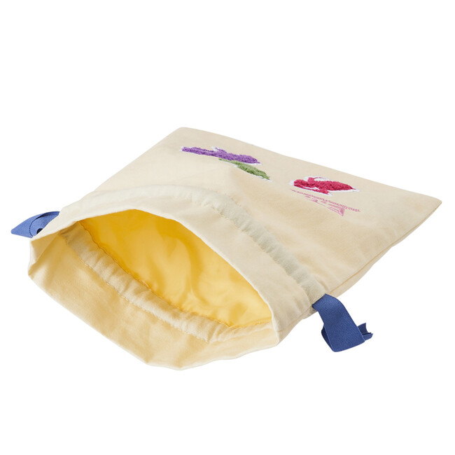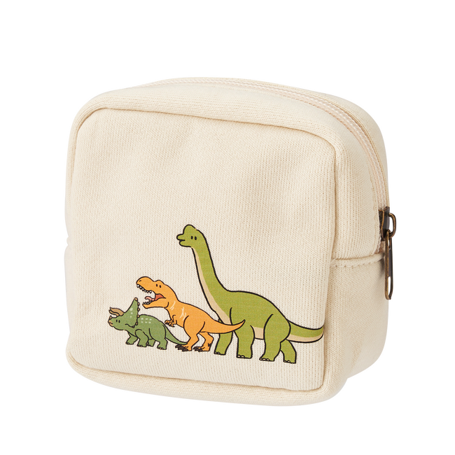 スウェット生地を使用したコロンとしたフォルムのポーチ、恐竜やE.T.がさがら刺繍でカラフルにデザインされている巾着は、小物を持ち歩くのに便利なアイテムです。