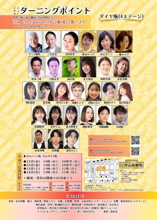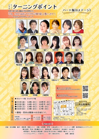 株式会社パン・プランニング主催、『ミュージカル ターニングポイント』が2023年9月21日(木)〜9月24日(日)に銀座博品館劇場(東京都中央区銀座8丁目8-11)にて上演されます。 チケットはカンフェティ(運営:ロングランプランニング株式会社、東京都新宿区、代表取締役:榑松 大剛)にて8月10日(木)19:00より発売開始です。