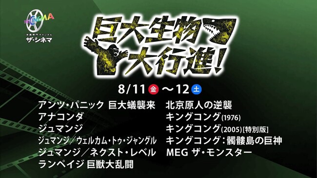 『MEG ザ・モンスター』(C) 2018 Warner Bros. Entertainment Inc., Gravity Pictures Film Production Company, and Apelles Entertainment, Inc. 『MEG ザ・モンスターズ2』(C) 2023 Warner Bros. Ent. All Rights Reserved. 『ジュマンジ』(C) 1995 TriStar Pictures, Inc. All Rights Reserved. 『ジュマンジ/ウェルカム・トゥ・ジャングル』(C) 2017 Columbia Pictures Industries, Inc. All Rights Reserved. 『ジュマンジ/ネクスト・レベル』(C) 2019 Columbia Pictures Industries, Inc. All Rights Reserved. 『キング・コング(2005)[特別版]』 (C) 2005 Universal Pictures. All Rights Reserved. 『キングコング:髑髏島の巨神』(C) 2017 WARNER BROS. ENTERTAINMENT INC., LEGENDARY PICTURES FUNDING, LLC AND RATPAC-DUNE ENTERTAINMENT LLC. ALL RIGHTS RESERVED. 『キングコング(1976)』(C) 1976 STUDIOCANAL 『北京原人の逆襲』(C) 2004 CELESTIAL PICTURES LTD. All Rights Reserved. 『ランペイジ 巨獣大乱闘』(C) 2018 Warner Bros. Entertainment Inc.All Rights Reserved 『アンツ・パニック 巨大蟻襲来』(C) 2018 It Came From The Desert Oy 『アナコンダ』(C) 1997 COLUMBIA PICTURES CORPORATION, INC. ALL RIGHTS RESERVED.