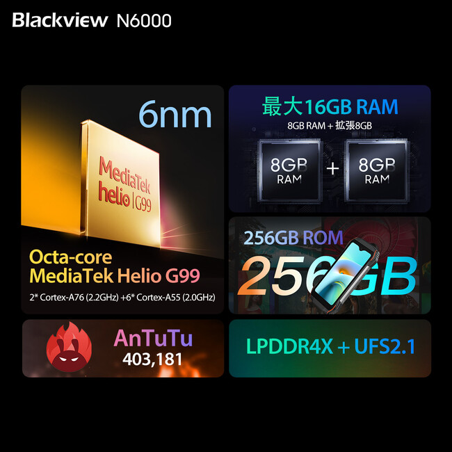 N6000は、MediaTek Helio G99オクタコアプロセッサーと最大16GBまでの拡張に対応したRAMを搭載しており、Antutuベンチマークで403,181のスコアを達成しています。また、多くのデータを保存するために256GBの内部ストレージが用意。